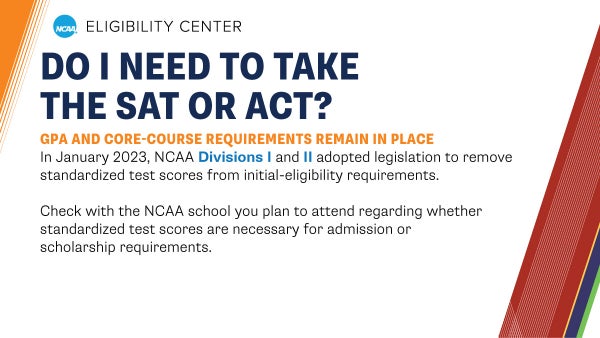 NCAA Division I and NCAADII removed the standardized test score requirement for all college-bound student-athletes enrolling in 2023 and beyond.